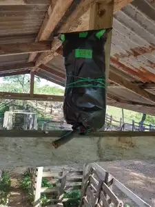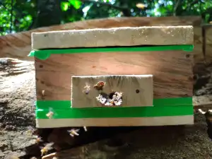 Un principio fundamental de nuestra api y meliponicultura es que no introducimos nuevas especies o variaciones genéticas en la reserva. Las abejas que criamos son, por tanto, colonias que se establecen en trampas para abejas de nuestras especies locales, o que rescatamos de situaciones que probablemente dañaría la colonia, por ejemplo, de un árbol caído. Las trampas para abejas están hechas de botellas de plástico recicladas o de baldes de plástico reciclado.